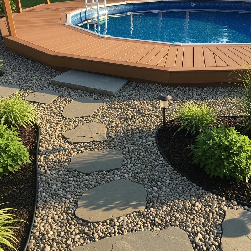 Sometimes the smartest budget solution isn't a deck at all. Creating a gravel and stepping stone surround costs just $400 to $800 while providing stable, attractive poolside access. This approach works especially well for renters who can't make permanent modifications. Start with landscape fabric to prevent weeds, add a layer of pea gravel, then position large stepping stones or pavers for walkways. The gravel provides excellent drainage, reducing puddles and mud around your pool. You can create distinct areas using different colored stones or adding border materials. Maintenance involves occasional raking and weed control, but there's no wood to rot or stain. This flexible design allows easy modifications as your needs change.