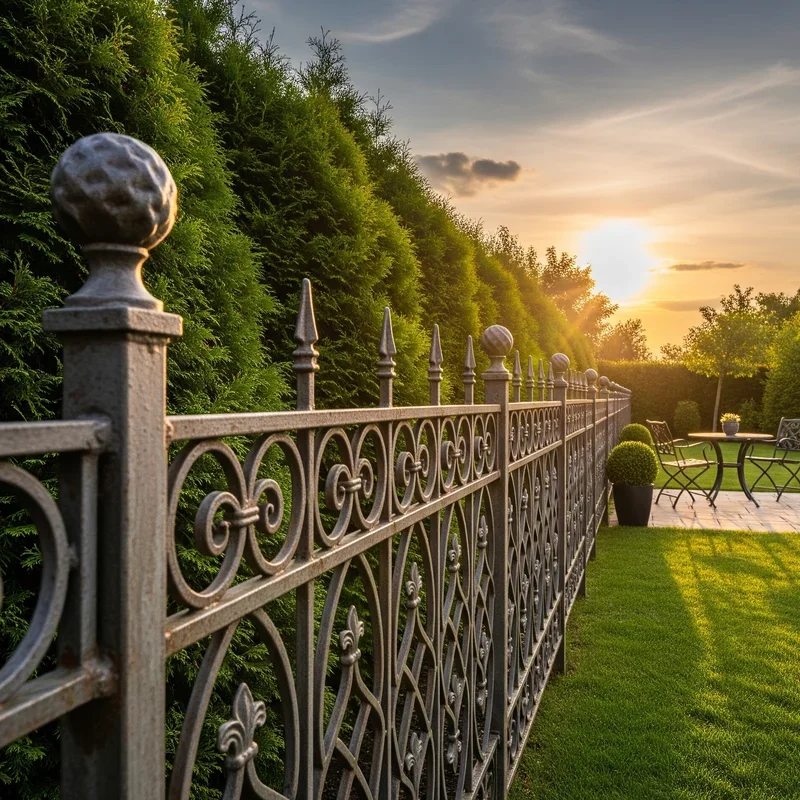 Channel your inner Victorian with decorative iron fencing that provides security without sacrificing style or views. These fences turn boundary marking into an art form through scrollwork, finials, and patterns that range from simple geometric to elaborate botanical designs. Modern powder coating eliminates rust concerns while offering color options beyond basic black. The see-through nature maintains visual connection with surroundings, perfect for showcasing landscaping. Aluminum alternatives offer iron's look at lower weight and cost, typically $20 to $30 per foot versus iron's $30 to $50. The open design makes small yards feel larger while still defining boundaries clearly. Combine with brick or stone pillars for substantial corner posts that anchor the design. Climbing roses or ivy soften the metal's hardness while adding privacy. Security features like pointed finials deter climbing without looking unwelcoming.