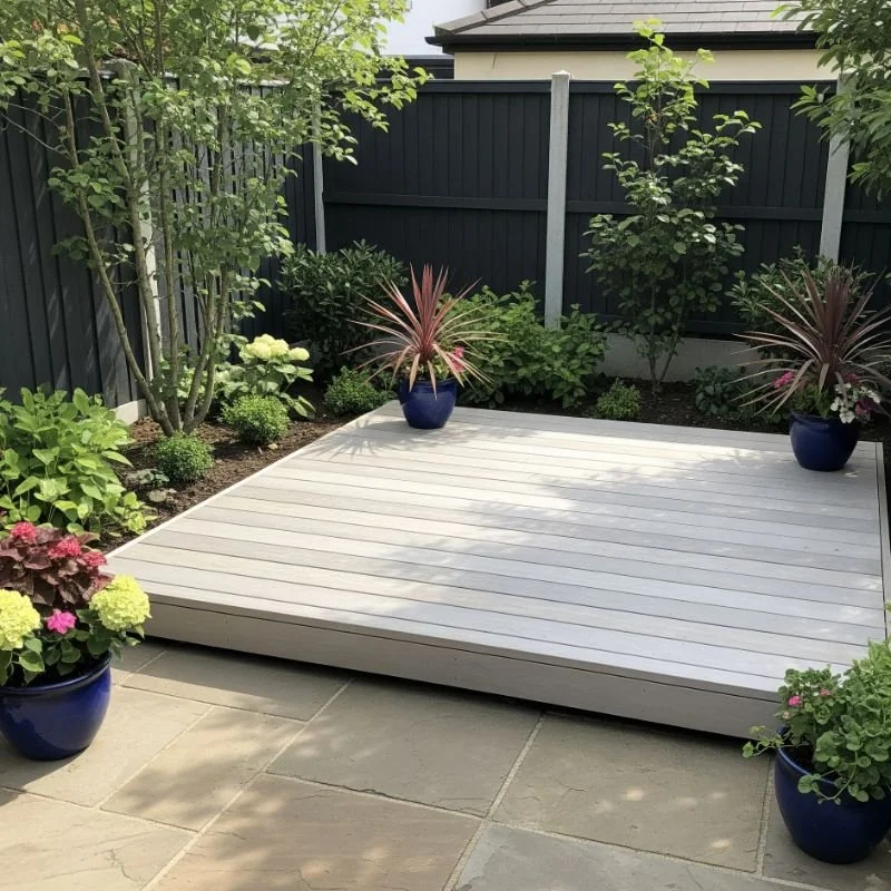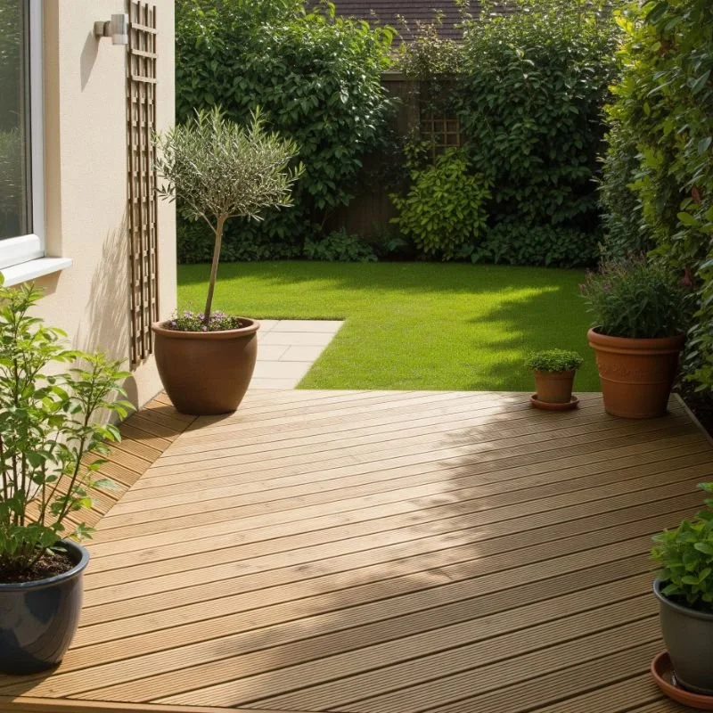 Here's a visual trick that costs nothing extra but makes your patio appear significantly larger: lay decking boards diagonally instead of straight. The angled lines draw eyes corner-to-corner, emphasizing the longest dimension of your space. This optical illusion works whether you're installing new decking or painting existing concrete with diagonal stripes. The pattern adds visual interest without cluttering, making simple spaces feel designed and intentional. Diagonal installation requires more cutting and waste (budget 10-15% extra materials), but the impact justifies the effort. Combine two tones for chevron patterns that amplify the effect. This technique works especially well on square or nearly-square patios where traditional layouts emphasize the boxy shape. Professional installation adds about $1-2 per square foot versus straight layouts.