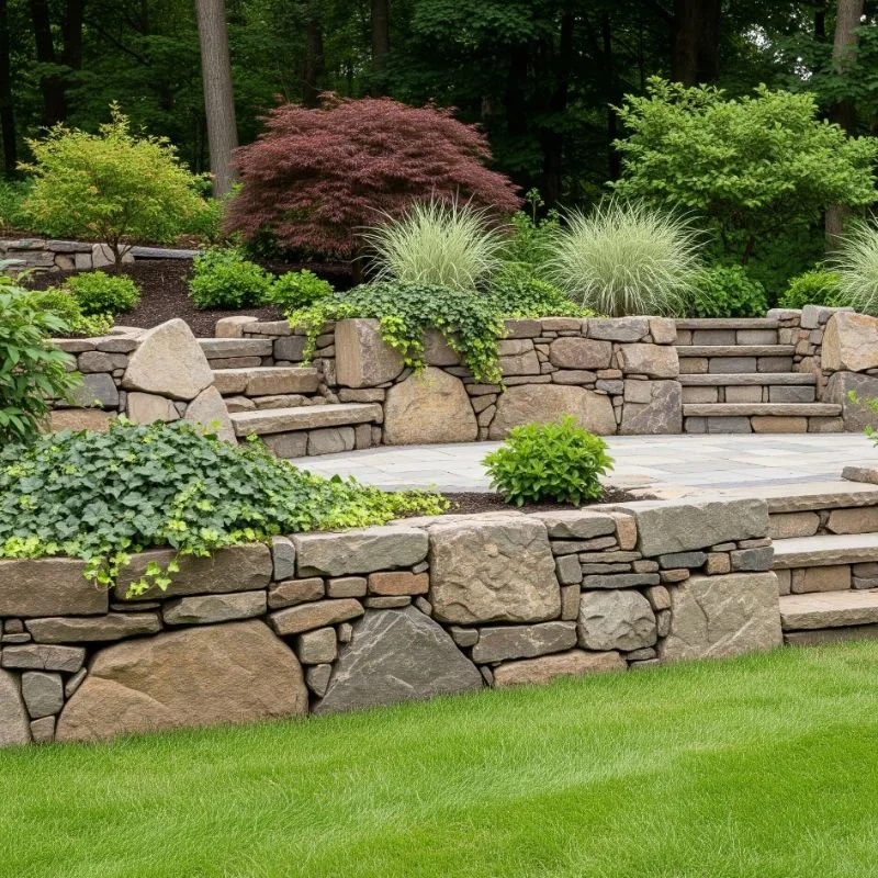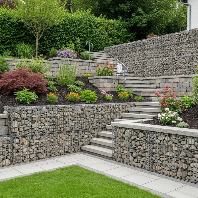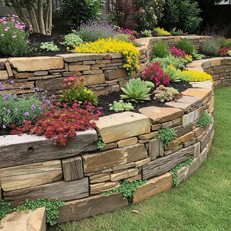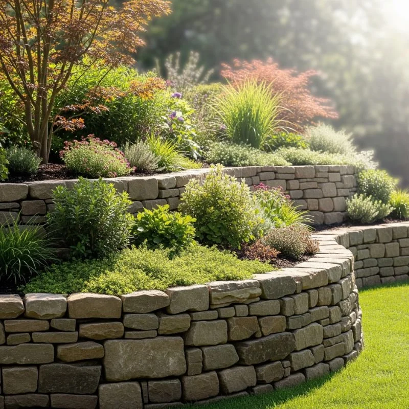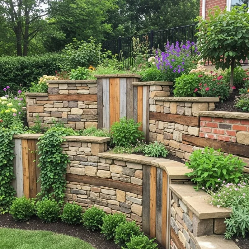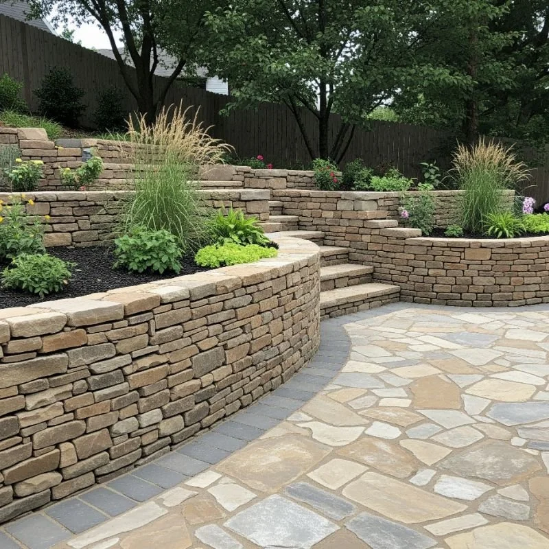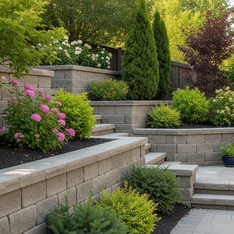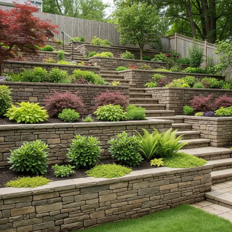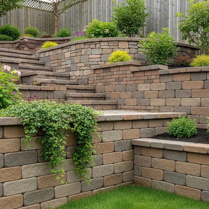 Convert steep slopes into productive garden space with terraced retaining walls creating multiple planting levels. Each terrace becomes a microclimate, perfect for different plants based on sun exposure and drainage. Design terraces wide enough for comfortable maintenance access and visual impact. Stepped walls reduce individual wall height, minimizing engineering requirements and costs. Incorporate stairs between levels for easy navigation and cohesive design. The horizontal lines draw eyes across the landscape rather than emphasizing vertical drops. Mix wall materials between levels for added interest while maintaining unity. Terracing prevents erosion while maximizing usable yard space. Include drip irrigation during construction for effortless garden maintenance. The architectural rhythm of repeated terraces creates stunning visual impact from every viewing angle.