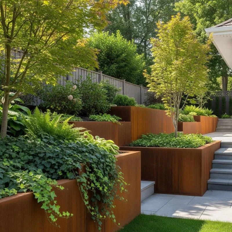 Make bold statements with Corten steel walls developing rich rust patinas over time. The weathering steel starts silver and transforms to warm orange-brown hues. Thin profiles maximize usable space while providing incredible strength. The industrial material suits modern architecture and minimalist landscapes perfectly. Laser-cut patterns create decorative screens combining retention with artistry. No maintenance required as protective rust layer prevents deeper corrosion. The warm tones complement both green plantings and hardscape materials. Professional fabrication ensures proper drainage and structural engineering. Heat absorption creates favorable microclimates for Mediterranean plants. The distinctive appearance guarantees your landscape stands out from conventional designs.