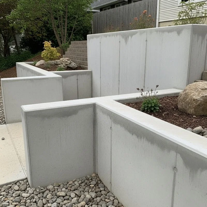 Achieve sleek contemporary lines with poured concrete walls offering ultimate design flexibility. Custom forms create any shape imaginable from curves to angles. Smooth finishes provide modern minimalism while textured surfaces add visual interest. Integral color options eliminate painting maintenance forever. The monolithic construction provides exceptional strength for tall walls. Board-forming techniques imprint wood grain patterns combining natural textures with concrete durability. Built-in lighting channels or water features integrate seamlessly during pouring. Professional installation ensures proper reinforcement and drainage systems. The permanent solution requires minimal maintenance beyond occasional cleaning. Combine with steel or glass accents for cutting-edge architectural statements.