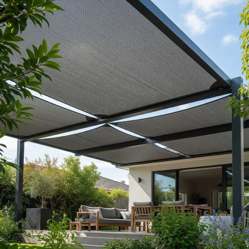 Install mesh shade panels that block sun while maintaining visibility and airflow for breezy comfort! Shade cloth comes in various densities from 30% to 90% blockage, priced around $20-40 per panel. Attach to existing structures with clips, ties, or framing. The commercial-grade material resists tearing and UV degradation. Black provides maximum shade while colored options add decorative elements. Create walls, overhead coverage, or angled installations for specific sun angles. The see-through nature maintains connection with surroundings unlike solid barriers. Trim to custom sizes with scissors for perfect fits. Overlapping panels increase protection where needed. This professional-looking solution costs fraction of custom awnings. The material stores flat during off-seasons. Perfect for covering pergolas, patios, or play areas needing serious sun protection.