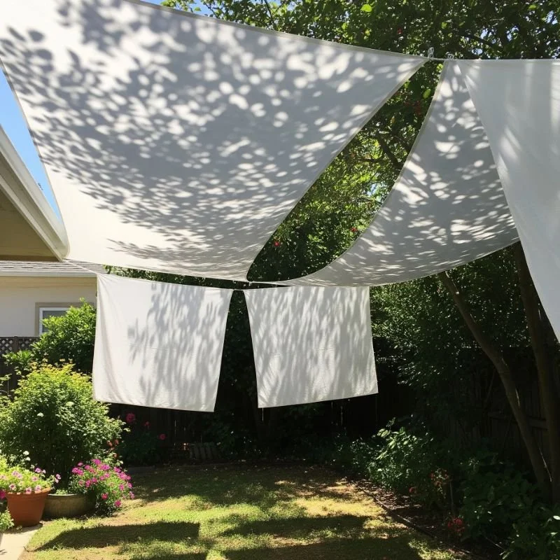 Unleash your inner sailor by creating shade sails from old bedsheets or inexpensive fabric that delivers designer looks for pennies! Purchase king-size sheets from thrift stores or use existing linens destined for retirement. Attach grommets at corners (kit costs under $10) for secure mounting points. String between trees, posts, or house attachments using weather-resistant rope or cable. The triangular or rectangular shapes create architectural interest while blocking harsh sun. Layer multiple sheets at different heights for increased coverage and visual depth. Light-colored fabrics reflect heat while darker options provide denser shade. This solution costs under $25 per sail versus $100+ for commercial versions. Replace easily when worn or change colors seasonally for fresh looks. The billowing fabric adds movement and life to static spaces.