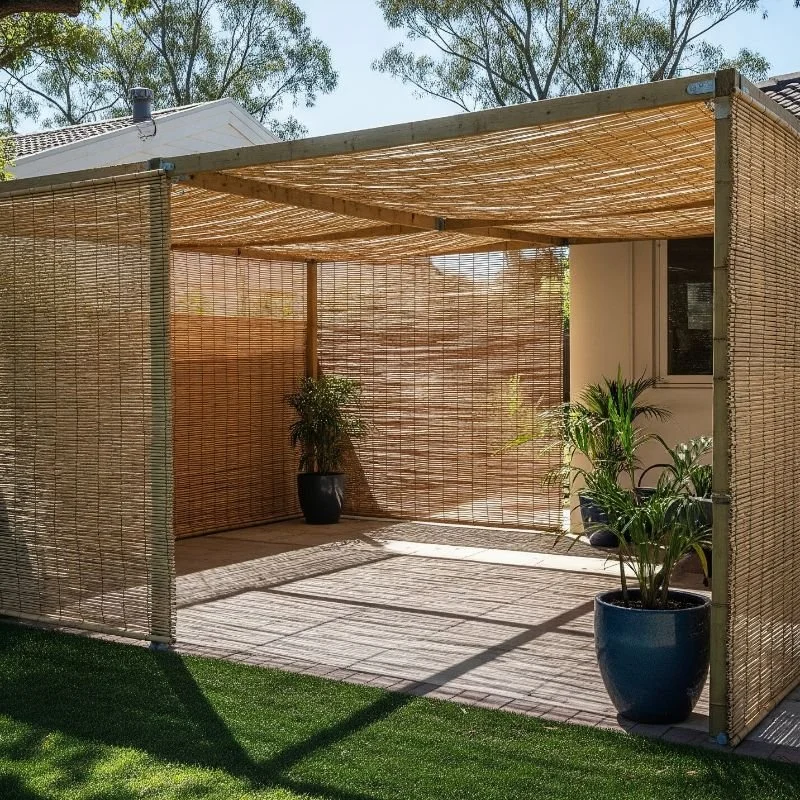 Embrace tropical vibes with bamboo screening that provides filtered shade and privacy for under $40 per panel! These renewable resource panels attach to existing fences, between posts, or create freestanding screens with basic frames. The natural variation in bamboo creates interesting shadow patterns while maintaining airflow. Roll-up versions offer adjustable coverage throughout the day. The lightweight material installs easily with zip ties, wire, or screws. Natural bamboo weathers to attractive silver-gray, or treat with sealers for extended life. Layer panels for denser shade or space them for dappled light. The organic aesthetic suits any garden style from modern to cottage. Combine with climbing plants for living walls that increase shade over time. This sustainable option appeals to eco-conscious homeowners seeking natural solutions.