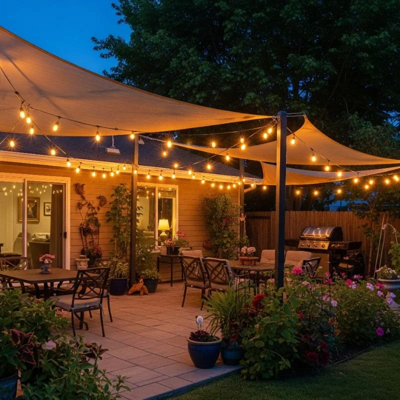 Combine ambiance with shade by creating string light canopies that work overtime for beauty and function! String heavy-duty cables in grid patterns between posts, trees, or house attachments. Drape fabric panels or shade cloth over the cables, securing with clips. The lights provide evening illumination while fabric offers daytime shade. This dual-purpose approach maximizes investment value. Use outdoor-rated LED strings for energy efficiency and longevity. The grid system allows seasonal fabric changes or removal during storms. White fabric glows beautifully when backlit at night. This romantic solution particularly suits dining areas or conversation spaces. Total cost runs $50-100 depending on area size. The enchanting atmosphere rivals expensive landscape lighting while providing practical benefits. Guests always compliment these magical ceiling treatments.