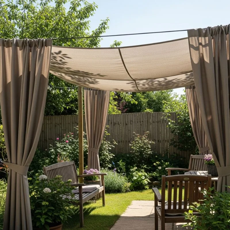 Create an outdoor room with privacy and shade using inexpensive curtains strung on galvanized wire! Shower curtains work brilliantly for waterproof options, while canvas drop cloths from hardware stores provide heavy-duty coverage under $20. Install eye hooks along your porch, between posts, or from pergola beams, then string aircraft cable for smooth sliding. The vertical coverage blocks low-angle morning and afternoon sun that umbrellas miss. Choose patterns for personality or solid colors for classic appeal. Tie-backs allow adjustable coverage and airflow when full shade isn't needed. This method works especially well for west-facing spaces that become afternoon ovens. Machine washable options simplify maintenance. The curtains create intimate spaces perfect for dining areas or reading nooks while adding soft textures to hard landscapes.