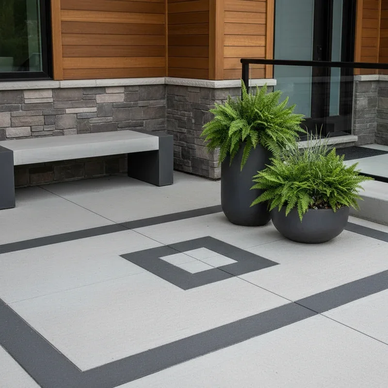 Borders and inlays add sophisticated detail to concrete porches, creating visual frames and focal points that elevate the entire design. Picture your porch with a contrasting border in darker concrete surrounding a lighter center field, or perhaps decorative tile inlays forming a welcoming pattern at the entrance. The technique involves saw-cutting patterns into existing concrete or planning designs into new pours. Materials like brass strips, decorative aggregates, or contrasting concrete colors fill these spaces, creating permanent artwork. Compass roses, family monograms, or nature-inspired motifs become conversation starters for guests. The added cost stays minimal compared to the visual impact achieved. These details work especially well for breaking up large concrete expanses that might otherwise feel monotonous or institutional.
