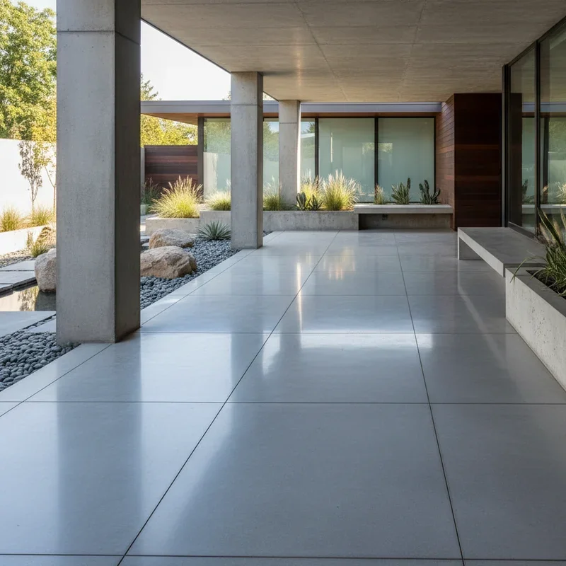 Polished concrete brings showroom sophistication to your porch through a multi-step grinding process that creates a mirror-like finish rivaling marble or granite. The transformation begins with diamond grinding pads that progressively refine the surface from coarse to ultra-fine. Densifiers penetrate the concrete, hardening it while enhancing light reflection for that coveted glossy appearance. Choose from cream polish for subtle elegance or salt-and-pepper exposure for added visual interest. The resulting surface resists stains, requires minimal maintenance, and actually improves with age as foot traffic naturally maintains the polish. Indoor-outdoor flow improves dramatically when polished concrete extends from porch to interior spaces. Despite its upscale appearance, polished concrete costs significantly less than natural stone alternatives while delivering comparable aesthetic impact.