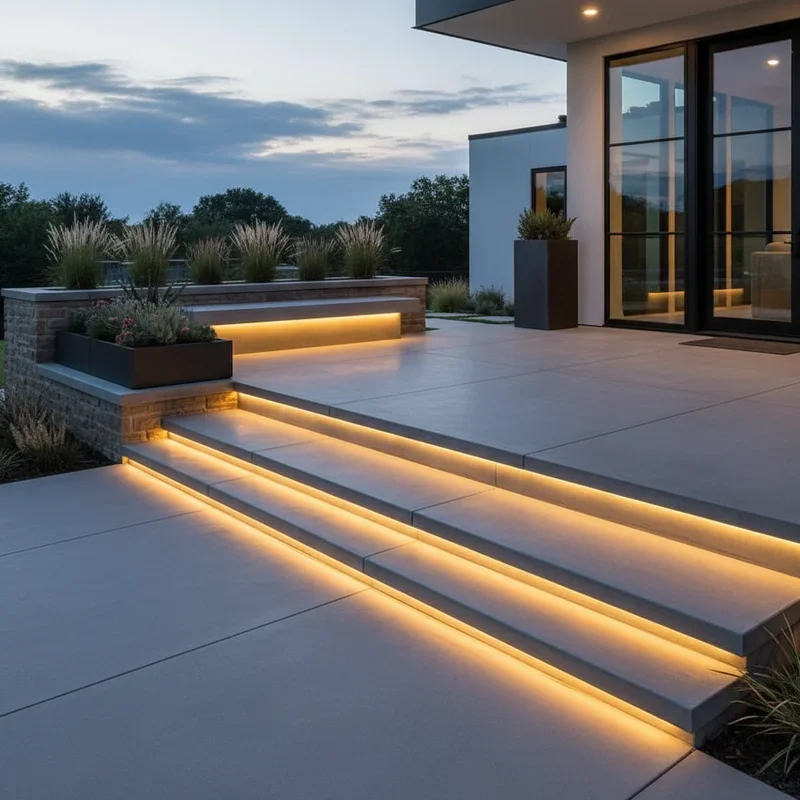 Embedding lighting directly into your concrete porch creates magical evening ambiance while improving safety and highlighting architectural features. LED strips can outline steps, while recessed fixtures provide subtle uplighting without visible hardware cluttering the surface. Fiber optic points create starfield effects, particularly stunning in polished or dark-stained concrete. Planning happens before pouring, with conduits and fixtures positioned precisely for optimal effect. Solar-powered options eliminate electrical concerns while smart systems allow color changes and dimming via smartphone control. The illumination transforms your porch from daytime functional to nighttime theatrical. Safety improves dramatically with well-lit walking surfaces, reducing trip hazards for family and guests. Consider how lighting will interact with other decorative treatments like staining or stamping for maximum impact.