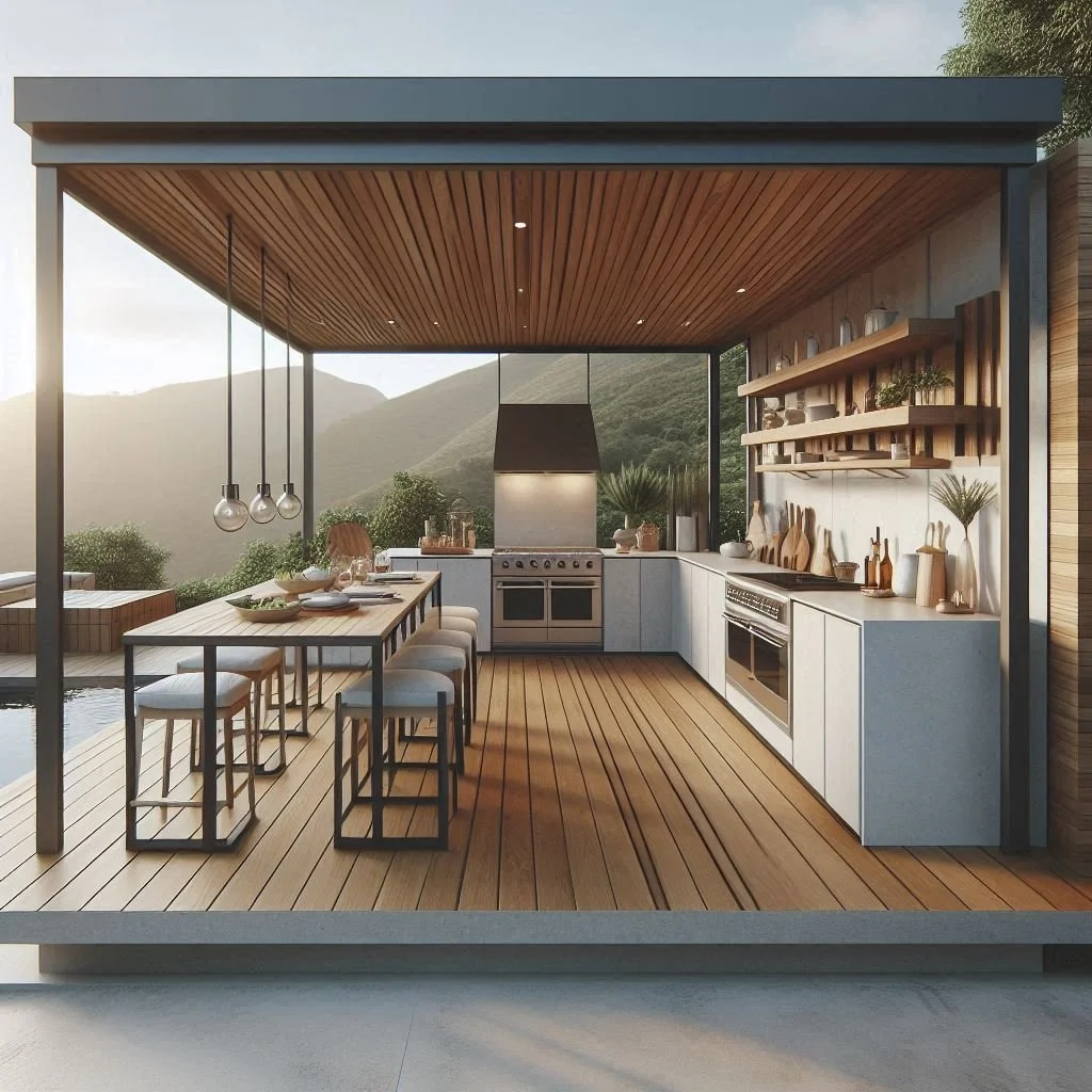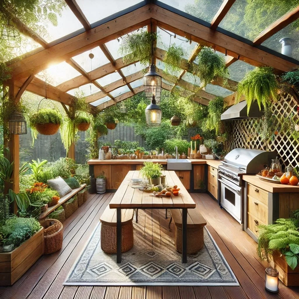 If you’re passionate about sustainability and natural light, a greenhouse-style outdoor kitchen is a perfect choice! Featuring transparent roofing and glass walls, this design allows maximum sunlight to flood the space while keeping it sheltered from rain and wind. The bright, airy atmosphere creates an inviting setting where you can cook and dine surrounded by lush greenery. Incorporate eco-friendly materials, such as reclaimed wood, recycled countertops, and energy-efficient appliances, to reduce your environmental impact. Add hanging herb gardens, potted citrus trees, or climbing vines for a fresh, organic touch that enhances both beauty and functionality. Whether it's a sunny breakfast or a cozy evening gathering, this nature-infused kitchen blends sustainability with modern convenience, creating a serene backyard retreat.