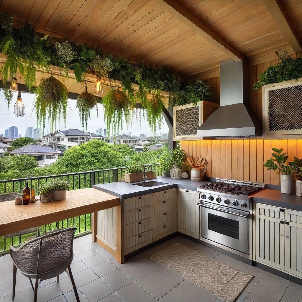 Short on space? No worries! A small balcony or patio can still become a functional and stylish outdoor kitchen with the right setup. A compact grill station, paired with space-saving countertops and foldable bar stools, maximizes every inch while maintaining a sleek, modern look. A retractable canopy offers flexible shade, keeping you cool during hot days and allowing open-air dining when the weather is just right. Opt for built-in storage solutions, like wall-mounted shelves or hidden cabinets, to keep utensils and ingredients within easy reach without cluttering the space. Add string lights, potted herbs, and a cozy bistro set to enhance the ambiance. Even in a small space, big flavors and unforgettable moments are always within reach with this efficient outdoor kitchen design!