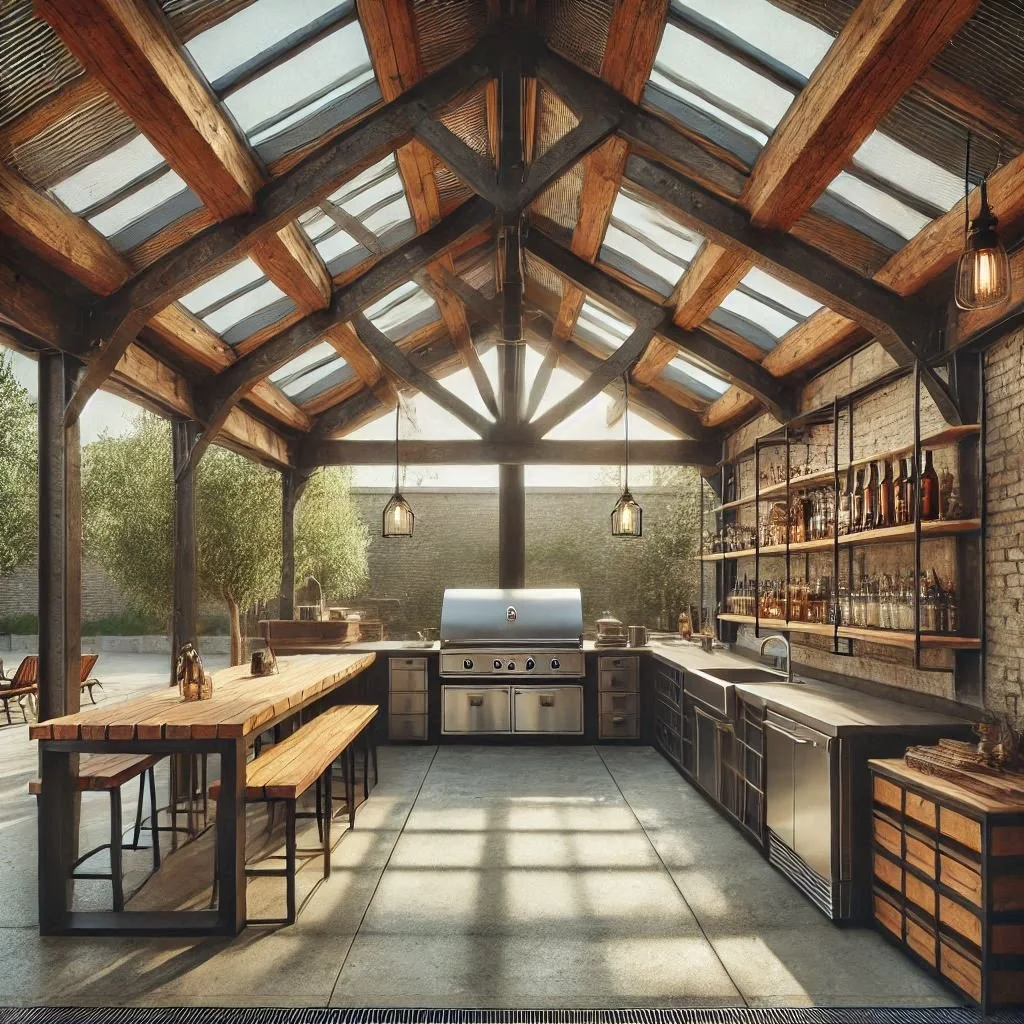 Industrial-style outdoor kitchens are a bold, modern choice that blends rugged aesthetics with sleek functionality. A black metal pergola provides both structure and shade, while steel beams and exposed hardware add an edgy, urban feel. For a durable and stylish workspace, opt for concrete countertops, which not only look sleek but also withstand the elements with ease. Pair them with stainless-steel appliances for a polished, professional look that complements the industrial theme. To warm up the space, incorporate wood or brick accents, balancing the raw materials with rustic charm. Finish off with industrial-style pendant lights and metal bar stools for an effortlessly cool vibe. This modern, loft-inspired outdoor kitchen is perfect for those who love a fusion of strength and style in their backyard.