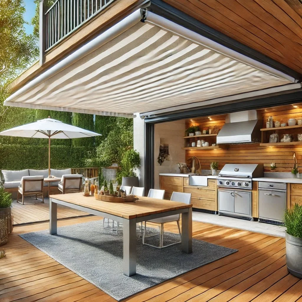 A retractable awning offers the best of both worlds, giving you instant shade on sunny days and the freedom to enjoy an open-air setting whenever you like. Whether you're grilling under the summer sun or stargazing at night, this flexible cover adapts to your needs. Opt for a waterproof, UV-resistant fabric to ensure durability against rain and sun exposure, keeping your outdoor kitchen protected year-round. The sleek, modern design of a retractable awning seamlessly blends with any backyard style, from contemporary patios to rustic farmhouse setups. Plus, motorized options make it effortless to adjust with the push of a button. Want extra ambiance? Add built-in LED lights or string lights to create a cozy, inviting atmosphere for evening gatherings.