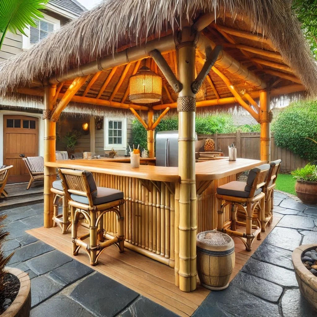 Transform your backyard into a tropical paradise with a tiki bar-style outdoor kitchen, perfect for entertaining and unwinding in a resort-like setting. Incorporate bamboo materials for the structure, a thatched roof for an authentic island feel, and a built-in bar stocked with refreshing drinks and tropical décor. Imagine sipping a homemade piña colada while grilling under the shade, surrounded by palm trees, tiki torches, and woven rattan barstools. To enhance the ambiance, add string lights or hanging lanterns, and consider installing a mini waterfall or a small fire pit to complete the tropical retreat. Whether hosting a luau or enjoying a casual outdoor dinner, this breezy, beach-inspired kitchen will make every gathering feel like a vacation!