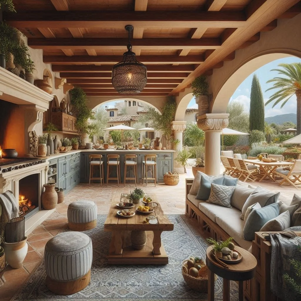 Create a stunning Mediterranean-inspired outdoor kitchen by combining terracotta tiles, natural stone walls, and an open fireplace for a warm, inviting ambiance. This design blends Old World charm with modern functionality, making it perfect for both intimate dinners and lively gatherings. The earthy tones of terracotta add warmth underfoot, while stone-clad walls provide texture and durability, standing up to the elements with ease. To enhance the Mediterranean aesthetic, incorporate an arched entryway that exudes timeless elegance and wrought-iron accents on lighting fixtures, furniture, or even decorative wall panels. Complete the look with lush greenery, olive trees, and potted lavender to transport your senses straight to the coasts of Spain or Italy. This luxurious yet laid-back retreat is perfect for alfresco dining year-round.