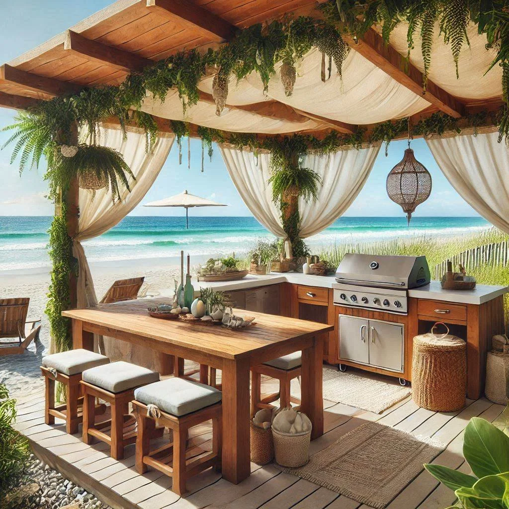 Transform your backyard into a coastal paradise with a whitewashed wooden canopy that sets the stage for a breezy, nautical-inspired outdoor kitchen. The light, airy tones instantly create a relaxed, beachy vibe, making every meal feel like a seaside getaway. Choose a weather-resistant kitchen set in soft white or light blue hues to complement the theme while ensuring durability against the elements. Enhance the coastal charm with rope accents, driftwood details, and woven rattan furniture that add texture and authenticity. For extra ambiance, hang lantern-style lighting or incorporate seashell decorations to complete the look. Whether you’re hosting a summer cookout or enjoying a quiet evening by the grill, this setup delivers a fresh, ocean-inspired escape right at home.