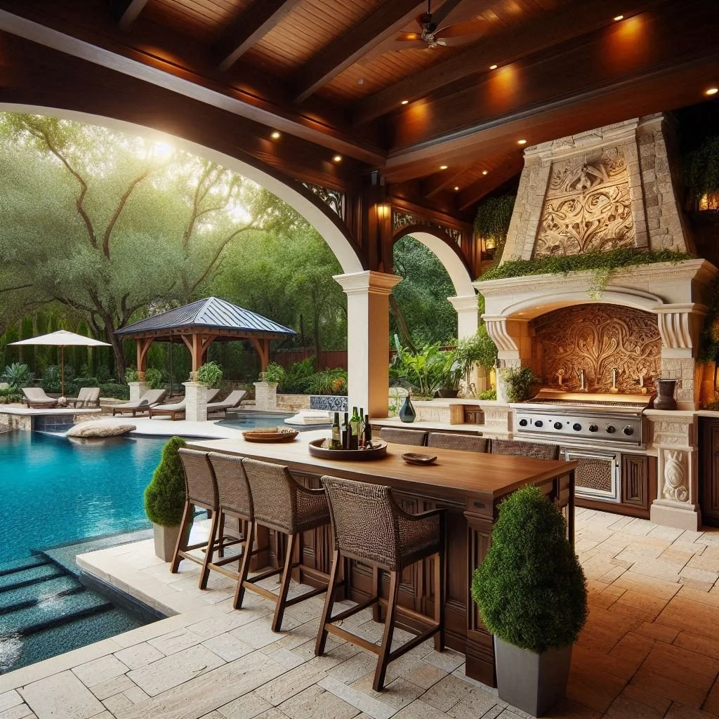Elevate your backyard experience with a luxurious poolside outdoor kitchen under a stylish pavilion, creating the perfect setting for entertaining and relaxation. Imagine whipping up delicious meals while your guests lounge by the pool, enjoying refreshing drinks at a sleek bar counter with high stools. This setup blends functionality with elegance, offering a shaded retreat for cooking, dining, and socializing. Opt for weather-resistant materials like stainless steel, stone, or teak wood to ensure long-lasting durability. To enhance the resort-style ambiance, incorporate LED strip lighting, pendant lights, or even a built-in sound system for ultimate comfort. Whether it’s a weekend BBQ or a sunset cocktail hour, this poolside pavilion kitchen turns your outdoor space into a five-star getaway at home!