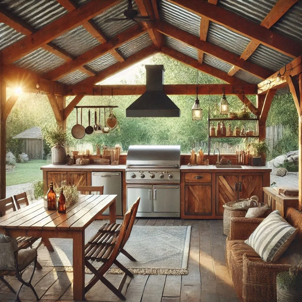 5. Farmhouse-Style Outdoor Kitchen with a Tin Roof