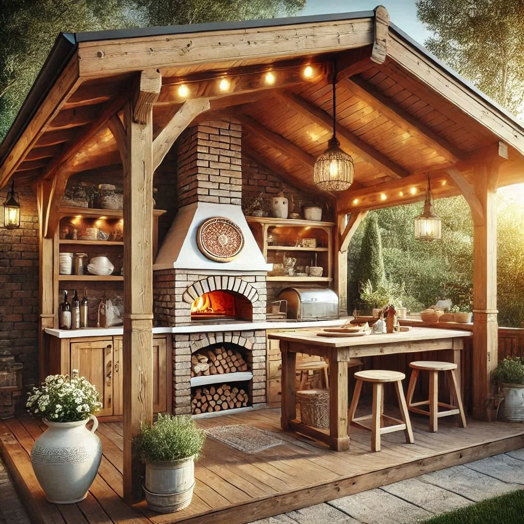 A wooden gazebo with a built-in brick pizza oven creates the ultimate outdoor gathering space, blending rustic charm with delicious functionality. Picture this: a warm, crackling fire, the scent of wood-fired pizza wafting through the air, and friends and family gathered under a cozy, covered structure—pure backyard bliss! The sturdy wooden beams provide shelter from the elements, allowing year-round use, while the brick oven becomes the heart of the space, perfect for crafting homemade Neapolitan-style pizzas, fresh-baked bread, or even roasted veggies. Enhance the ambiance with string lights, a long farmhouse dining table, and cushioned seating to encourage lingering meals and lively conversations. Whether for casual dinners or special occasions, this rustic outdoor kitchen guarantees unforgettable moments!