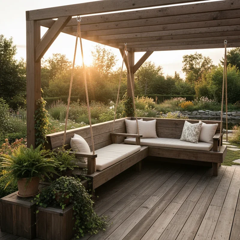 Add playful motion with swing benches suspended from sturdy overhead structures, bringing childhood joy to adult outdoor spaces. These swinging seats attach to pergola beams or dedicated A-frame supports, creating gentle movement that soothes and relaxes. The swaying motion naturally encourages longer outdoor sessions, making your deck feel more like a destination retreat. You're installing happiness, creating spots where stress literally swings away with each gentle push. Choose weather-resistant rope or chain suspensions rated for adult weights with significant safety margins included. The bench itself should be heavy enough to swing smoothly without flipping but light enough for easy movement. Position swings to avoid collision paths with other deck elements or traffic areas importantly. Add cushions secured with ties to prevent sliding during swinging motions while maintaining comfort levels.