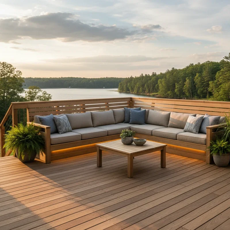 Create an outdoor living room with L-shaped sectional benches that define conversation areas while maximizing corner spaces efficiently. These substantial seating arrangements anchor your deck's layout, providing a natural focal point for furniture arrangement and traffic flow. The perpendicular design allows large groups to interact comfortably without anyone feeling excluded from conversations happening nearby. You're building community into your deck design, creating spaces that naturally bring people together for meaningful connections. Add thick cushions and weather-resistant throw pillows to rival indoor comfort levels while maintaining outdoor durability. The L-shape works particularly well when positioned to capture two different views or create wind-protected seating areas. Build in side tables at the corner junction for convenient drink and snack placement during gatherings. Consider making one section longer than the other to accommodate lounging or even afternoon naps outside.