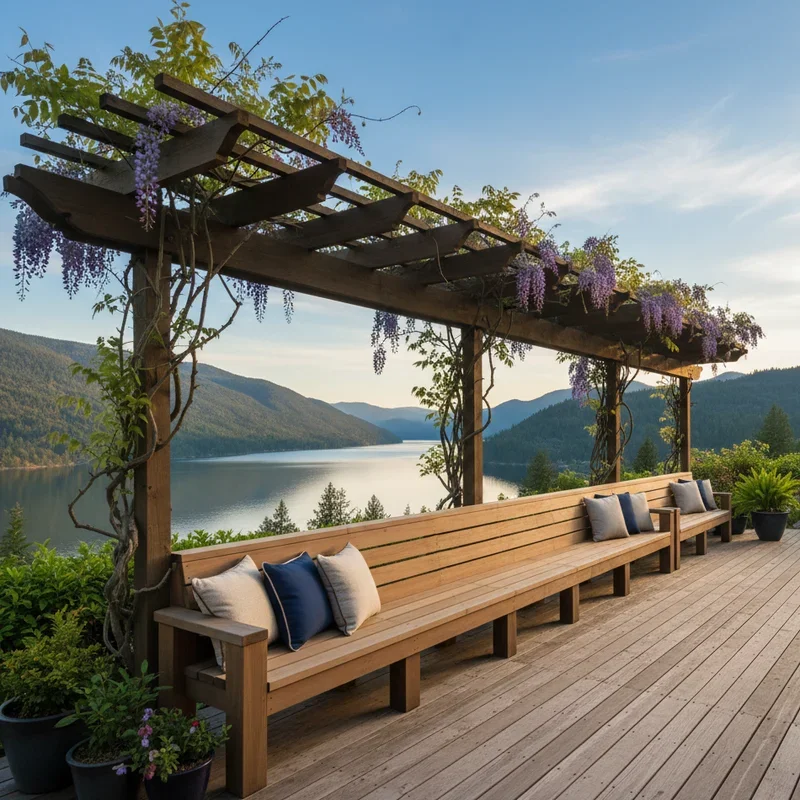Combine seating with shade by building benches beneath pergola structures that provide relief from sun and light rain. These covered seating areas create outdoor rooms within your deck, defining spaces while adding vertical architectural interest. The overhead structure supports climbing plants, hanging lights, or fabric panels for additional shade when needed. You're creating microclimates, making deck usage comfortable even during hot afternoons when uncovered areas become unbearable. The pergola posts can integrate with bench construction, creating unified designs that look professionally planned and executed. This combination works particularly well for reading nooks or meditation spaces requiring consistent shade coverage. Train vines like wisteria or grapes over the pergola for living umbrellas that change with seasons. Add retractable shade cloth for adjustable coverage depending on sun angles and seasonal requirements.
