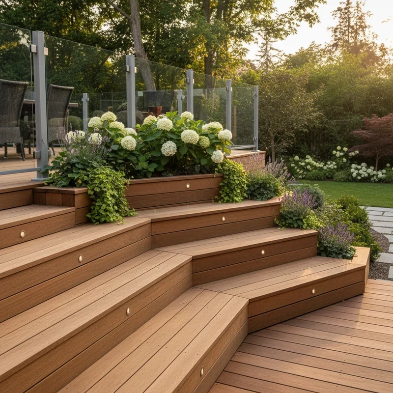 Create stadium-style seating with tiered benches that provide multiple viewing levels while maximizing seating capacity creatively. These stepped designs work brilliantly on multi-level decks or when creating amphitheater effects for outdoor entertainment. Each tier ensures unobstructed views whether you're watching kids play, enjoying sunsets, or hosting outdoor movie nights. You're engineering sight lines, ensuring everyone gets front-row experiences regardless of where they're sitting actually. The tiers can incorporate storage underneath or house potted plants between levels for added greenery. This design particularly suits decks overlooking scenic views or those used for regular entertaining purposes. Build wider lower tiers for stability and gradually narrow toward the top for elegant proportions. Include handrails between levels for safety, especially when children or elderly guests use the seating.