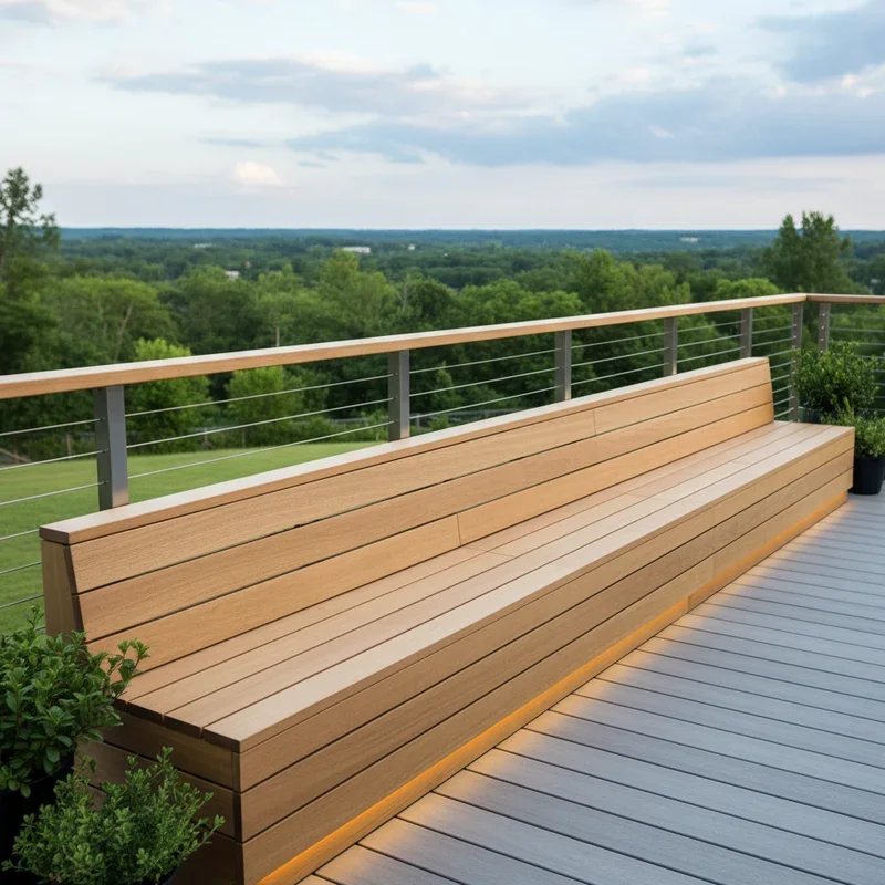 Combine seating with safety using benches that incorporate cable railings, creating contemporary designs that maintain view lines beautifully. These sleek benches feature horizontal cables running through posts, providing required safety barriers without visual obstruction. The industrial materials like stainless steel cables and powder-coated posts resist weather while looking effortlessly modern always. You're achieving minimalism that maximizes, providing necessary functions without cluttering your deck's aesthetic unnecessarily. The thin cables practically disappear from certain angles, preserving precious views of gardens or landscapes beyond. This design particularly suits contemporary homes where traditional bulky railings would clash with clean architectural lines. Add wood or composite seating surfaces to warm up the metal elements and provide comfort effectively. The combination of materials creates visual interest through contrast while maintaining a cohesive modern appearance throughout.