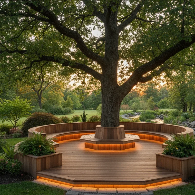 Honor existing trees by building wraparound benches that encircle trunks, creating magical seating that celebrates nature's architecture. These circular or hexagonal benches turn trees into living umbrellas providing natural shade and ambiance. The design allows trees to continue growing while providing 360-degree seating that accommodates groups comfortably together. You're partnering with nature, creating harmony between built and natural elements that enhances both beautifully. Leave adequate space around trunks for growth and air circulation to maintain tree health continuously. The bench can be built in sections for easier installation and future adjustments as trees expand. This design works wonderfully for decks built around existing trees or those with nearby shade trees. Add backrests on the outer edge while keeping the inner edge backless for flexible seating arrangements.