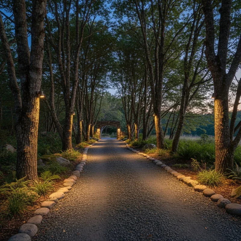 Harness the natural architecture of trees lining your driveway by mounting discrete spotlights that provide illumination from above. These fixtures attach securely to trunks or branches, directing light downward onto your driveway surface while remaining virtually invisible during daylight hours. The elevated position provides broad coverage without ground-level obstacles, perfect for driveways with limited space for traditional fixtures. Choose adjustable models that let you fine-tune beam angles as trees grow and seasons change. Warm white LEDs create a moonlight effect that feels natural and inviting, while cooler tones provide crisper visibility for security purposes. Professional installation ensures proper mounting that won't damage trees while maintaining electrical safety standards.