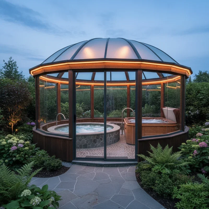 Design the ultimate relaxation zone with enclosed gazebos specifically built around hot tubs or spa features! Proper ventilation systems manage humidity while maintaining comfortable temperatures year-round. Privacy walls or frosted glass ensure seclusion during spa sessions while still allowing natural light. Non-slip flooring materials like textured composite decking or rubber surfaces ensure safety in wet conditions. Include storage for towels, robes, and spa accessories to keep everything organized and within reach. Consider adding a changing area or small bathroom for complete convenience. Mood lighting systems with color-changing LEDs enhance the spa atmosphere. Built-in sound systems resistant to moisture let you enjoy music or nature sounds during relaxation. The enclosed design means you can enjoy your hot tub regardless of weather, extending its use throughout the year.