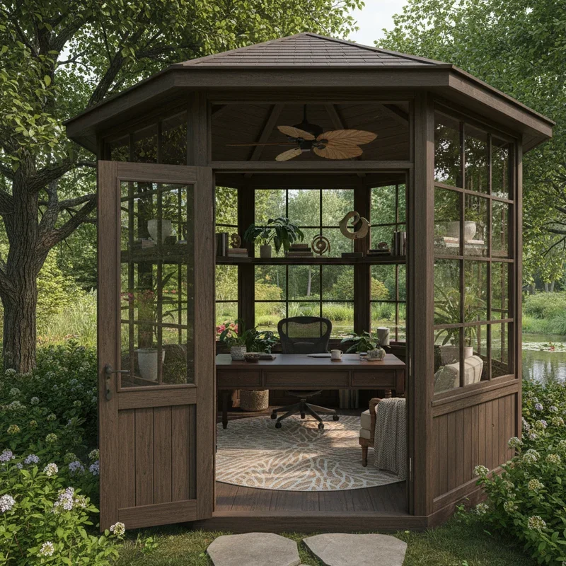 Transform your work-from-home experience with a dedicated office gazebo that separates professional life from home distractions! Insulated walls and windows ensure year-round comfort while maintaining energy efficiency. Electrical installations support computers, printers, and charging stations without unsightly extension cords. Built-in desks and shelving maximize workspace while maintaining the gazebo's aesthetic appeal. Natural light from multiple windows reduces eye strain and boosts productivity. Sound insulation allows for video calls without background noise interference. The physical separation from your main house creates psychological boundaries that improve work-life balance. High-speed internet connectivity via ethernet or enhanced WiFi ensures reliable connections. The garden views provide calming backgrounds for video calls while inspiring creativity. This dedicated workspace eliminates the need for expensive office rentals while providing tax deduction opportunities.