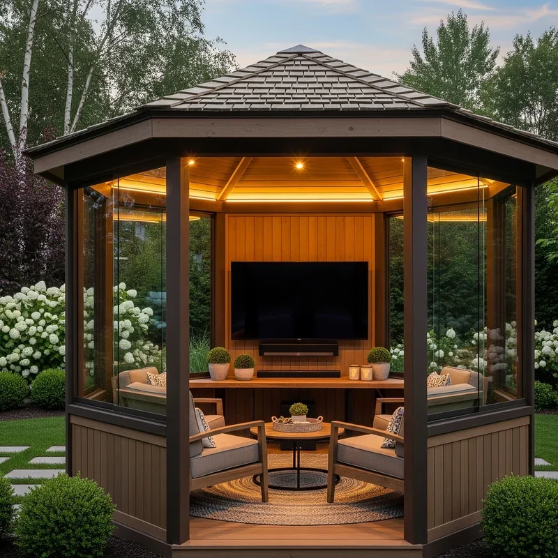 Design the ultimate entertainment space with gazebos equipped for hosting and leisure activities! Install weatherproof televisions and sound systems for outdoor movie nights or sports viewing. Built-in bars or kitchenettes eliminate constant trips to the main house during gatherings. Comfortable seating arrangements accommodate various group sizes and activities. Game tables for cards, board games, or puzzles create interactive entertainment options. Smart lighting systems adjust from bright task lighting to ambient mood lighting instantly. Climate control ensures comfort regardless of weather, extending your entertaining season. Storage for games, barware, and entertainment equipment keeps everything organized. The enclosed space allows for louder activities without disturbing neighbors. WiFi extenders ensure strong connectivity for streaming and gaming. This versatile space transitions from family game room to adult cocktail lounge effortlessly.