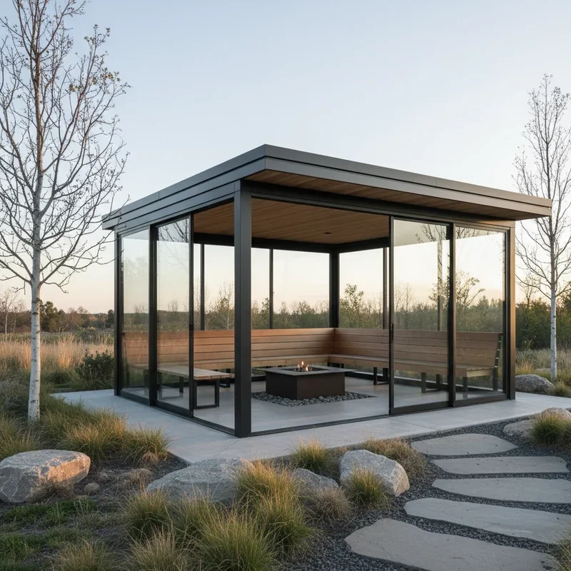 Streamline your outdoor retreat with sleek, minimalist gazebo designs that emphasize clean lines and uncluttered spaces! Aluminum or steel frames with large glass panels create geometric structures that complement contemporary architecture. Flat or single-slope roofs maintain the modern aesthetic while efficiently managing water runoff. Neutral color palettes in blacks, whites, and grays ensure the structure enhances rather than competes with your landscape. Built-in seating and storage maximize floor space while maintaining the minimalist philosophy. Smart home integration allows control of lighting, temperature, and even window tinting from your phone. The simplicity of design makes these gazebos surprisingly versatile, easily adapting to different uses from morning coffee spot to evening entertainment area. Less truly becomes more when every element serves both functional and aesthetic purposes.