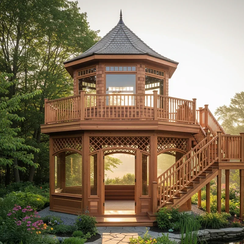 Maximize vertical space with innovative multi-level gazebos that provide distinct areas for different activities! Lower levels might feature lounging areas while upper decks offer panoramic views. Spiral staircases or ship ladders connect levels while maintaining the gazebo's footprint. Each level can serve different purposes: meditation space above, entertainment below. The elevation changes create visual interest and architectural drama in your landscape. Built-in storage under stairs maximizes every square foot of space. Multiple levels allow for better temperature control, with heat rising to upper areas in winter. Railings and safety features ensure secure movement between levels. The height provides better views over fences and landscaping. Different enclosure types on each level offer varied experiences within one structure.