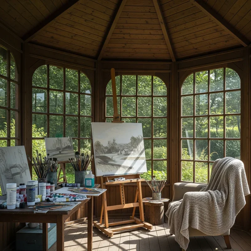 Transform creative pursuits with gazebos designed as dedicated art studios flooded with inspiring natural light! North-facing windows provide consistent, indirect light ideal for color accuracy. Storage systems for supplies keep materials organized and easily accessible. Easy-clean flooring handles inevitable spills and splatters without stress. Ventilation systems manage fumes from paints and solvents safely. Multiple electrical outlets support various tools and equipment needs. Adjustable lighting supplements natural light for detail work or evening sessions. Display areas showcase completed works, creating an inspiring gallery atmosphere. The separation from your main house prevents art supplies from overtaking living spaces. Sinks with running water facilitate cleanup without hauling supplies indoors. The private creative space encourages experimentation and artistic growth without judgment or interruption.
