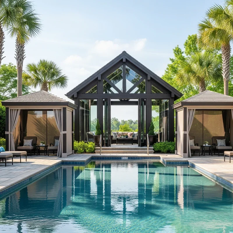 Enhance your pool area with enclosed gazebos that serve as elegant changing rooms and lounging spaces! Water-resistant materials throughout ensure durability in the humid pool environment. Include a bathroom or changing area for convenience and privacy. Storage for pool toys, towels, and maintenance equipment keeps the pool area organized. Sliding doors open wide to create seamless flow between pool deck and gazebo interior. Mini-fridges and bars keep refreshments close without requiring wet trips to the house. Ceiling fans help dry off swimmers while providing cooling breezes. The elevated position typical of gazebos provides excellent pool supervision for parents. Non-slip flooring prevents accidents when entering with wet feet. The enclosed space offers respite from intense sun while maintaining pool visibility.