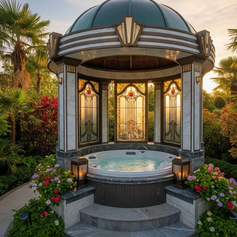 Channel the glamour of the roaring twenties with an Art Deco gazebo that makes bold geometric statements and celebrates luxury materials. This dramatic design features angular forms, metallic finishes, and geometric patterns that create sophisticated outdoor entertaining spaces. Black and gold color schemes with mirror accents reflect the era's love of luxury and drama. Built-in bars with period-appropriate fixtures make entertaining effortless and stylish. The angular rooflines and decorative elements create striking silhouettes that serve as garden focal points. Interior lighting using period-inspired fixtures with frosted glass or crystal elements adds authentic glamour. This style particularly suits properties with Art Deco or modern architecture where bold design statements are welcomed. The luxury materials and dramatic forms create spaces that feel like exclusive private clubs.