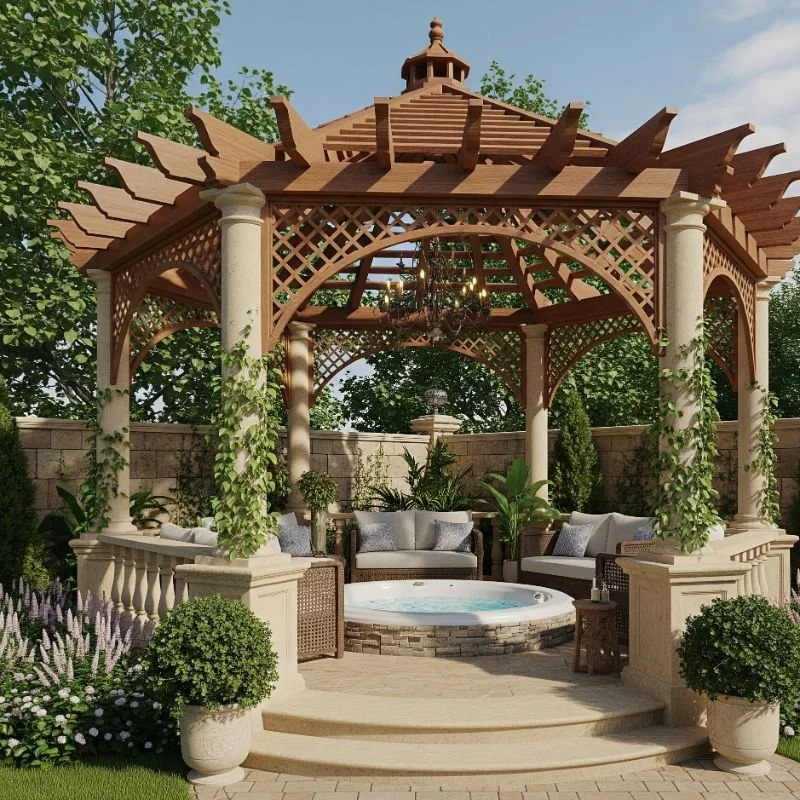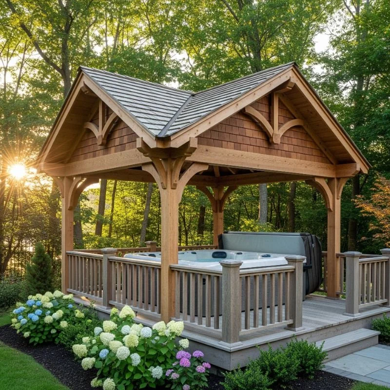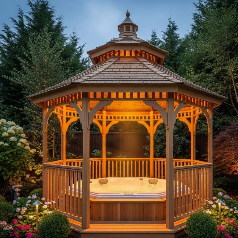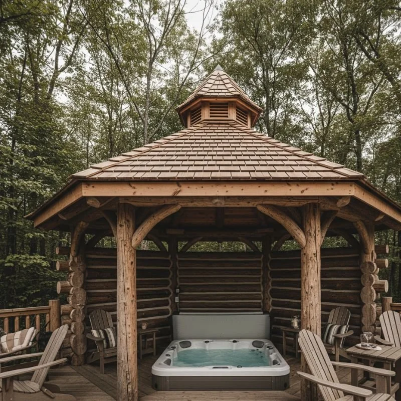 1. Classic Wooden Gazebo with Built-In Hot Tub