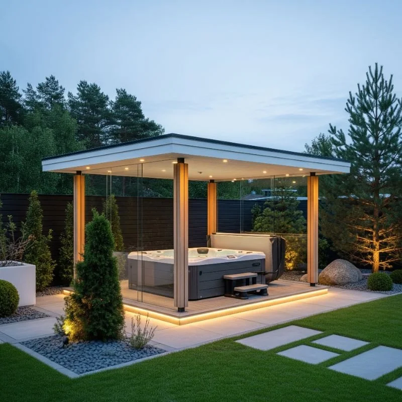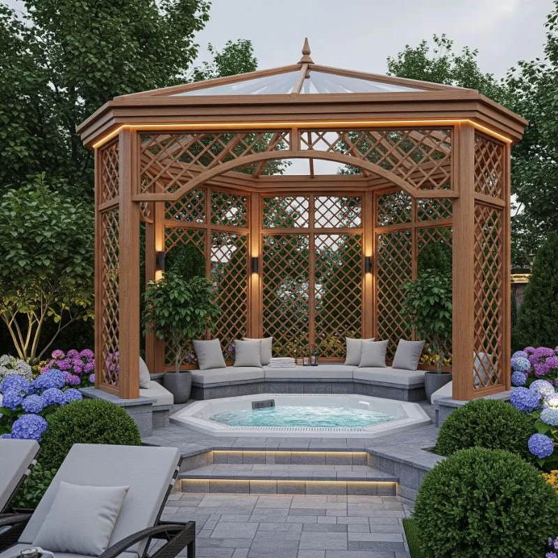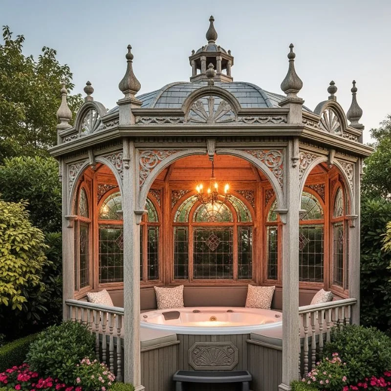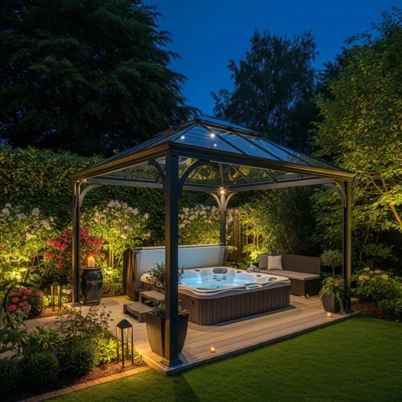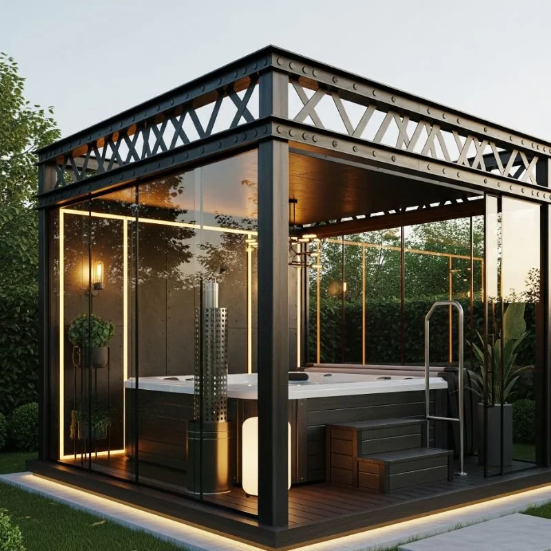 Embrace industrial elegance with a sleek metal frame gazebo that combines durability with modern style. This design features powder-coated steel or aluminum construction that resists rust and weather damage while maintaining clean, geometric lines. The minimalist framework supports various infill options like glass panels, fabric canopies, or living walls of climbing plants. Integrated cable lighting systems can create dramatic effects, while built-in speakers provide your perfect soaking soundtrack. The metal construction allows for larger spans without intermediate supports, creating more open space around your hot tub. Customizable powder coating colors let you match your home's exterior or create bold contrast statements. This style particularly suits contemporary homes and urban environments where clean lines and low maintenance are priorities.