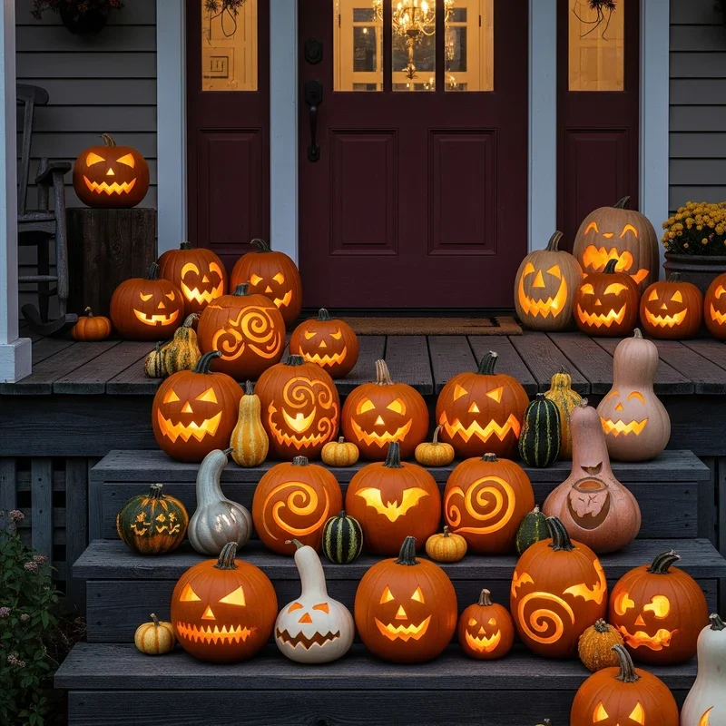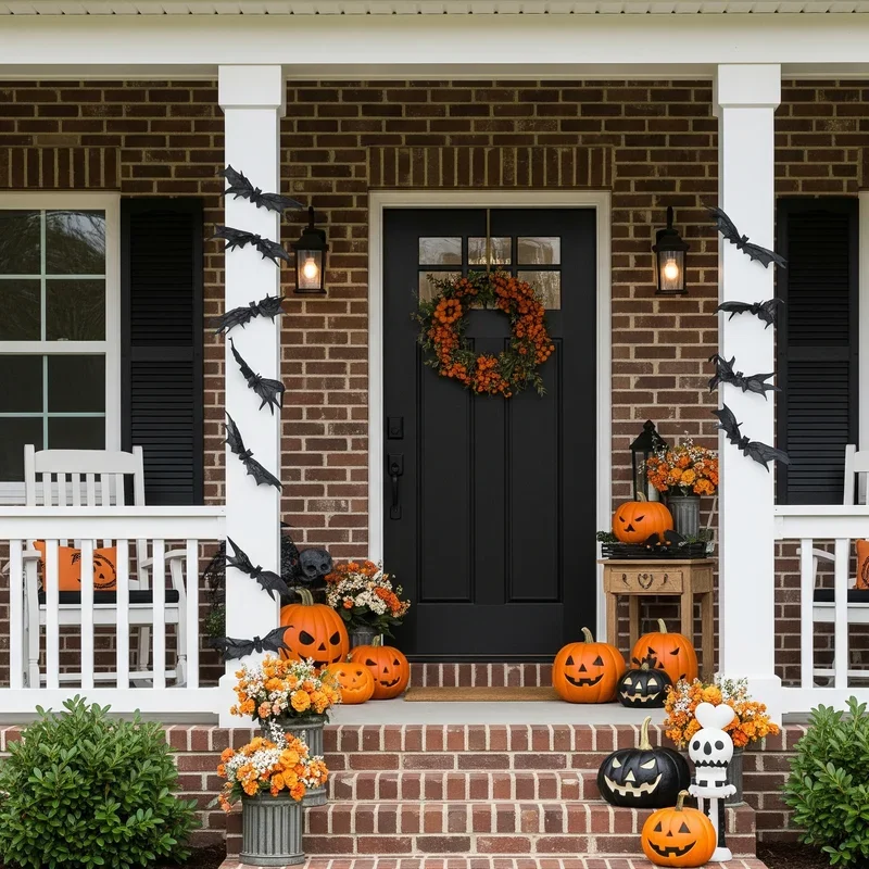 Build a pumpkin metropolis that showcases autumn's favorite gourd in ways that go beyond basic jack-o'-lanterns. Stack different sized pumpkins to create pumpkin topiary trees flanking your entrance like orange sentinels. Paint pumpkins in metallics, blacks, and deep purples for sophisticated Halloween elegance that photographs beautifully. Carve intricate designs using templates or freehand patterns that showcase your artistic skills beyond triangle eyes. Create pumpkin creatures by adding accessories like googly eyes, pipe cleaner legs, or yarn hair for personality. Use foam pumpkins for displays you want to reuse yearly, saving money while maintaining that authentic look. Arrange mini pumpkins along porch railings, spelling out spooky messages or creating gradient color patterns. Install battery-operated candles inside carved pumpkins for safe, long-lasting illumination that won't blow out. Mix real and artificial pumpkins strategically, using real ones where people look closely and foam where height matters.