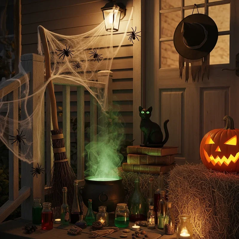 Design a wicked witch's workshop on your porch that looks like she just stepped out for eye of newt. Position a cauldron with dry ice or fog machine creating mysterious bubbling effects that mesmerize onlookers. Hang bundles of dried herbs, plastic bats, and potion bottles from porch ceiling beams. Create spell books using old hardcovers decorated with aging techniques and mystical symbols. Add a broomstick parking area with multiple brooms leaning against walls like a witch convention is happening. Display ingredient jars filled with creative labels like "Dragon Scales" containing painted pasta or "Fairy Wings" with iridescent tissue paper. Set up a fortune-telling station with crystal balls, tarot cards, and mysterious trinkets. Include witch legs sticking out from under decorations like she met an unfortunate end. Use purple and green lighting to cast an otherworldly glow over your entire witchy scene.