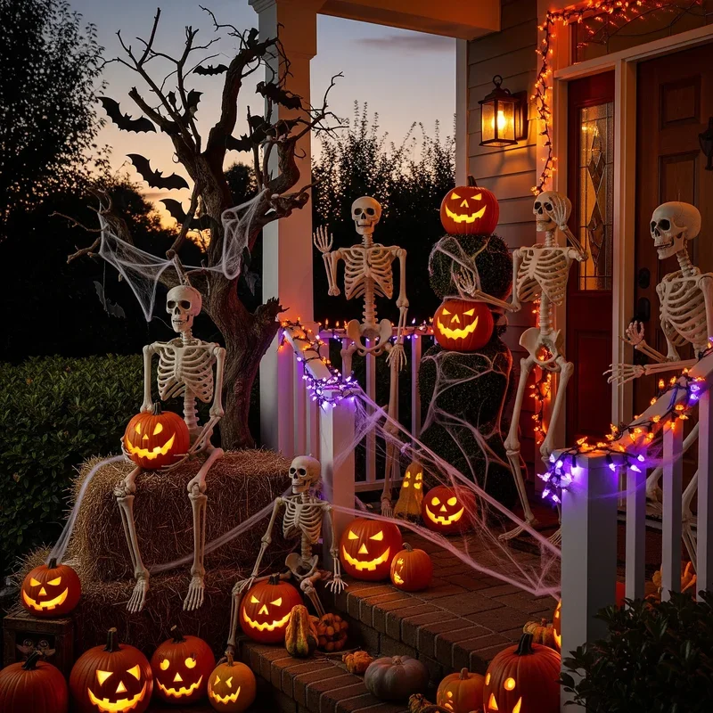 Position life-sized skeletons in hilariously unexpected scenarios that blend humor with horror for unforgettable porch displays. Arrange skeletons playing poker at a card table, complete with vintage hats and fake cigars for that underground speakeasy vibe. Create conversation by having skeletons engaged in everyday activities like reading newspapers, sipping tea, or taking selfies with props. Dress them in old clothes from thrift stores to give personality, making each skeleton a character with its own backstory. Use fishing line to pose arms and legs naturally, avoiding that stiff, store-bought look that screams amateur hour. Add LED eyes that light up at night for an extra creepy factor that catches visitors off guard. Position one skeleton peeking from behind pillars or hanging from porch railings like it's trying to escape. These bony buddies become instant photo opportunities that'll flood your social media with tags.