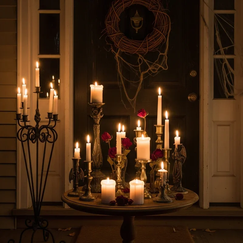 Create an elegant yet eerie ambiance with countless candles that transform your porch into a Victorian séance setting. Arrange battery-operated candles of varying heights on every available surface for dramatic lighting effects. Use candelabras, lanterns, and hurricane glasses to add Gothic architectural elements to your display. Incorporate black lace, velvet ribbons, and dried roses among candles for romantic horror vibes. Add mirrors strategically to multiply candlelight reflections and create infinite mysterious depths. Drip red wax on some candles to simulate blood for subtle horrific touches. Place LED candles inside painted wine bottles for colorful, safe lighting alternatives. Include floating candles suspended from fishing line for magical hovering effects. Use timer functions on battery candles to create synchronized lighting sequences that mesmerize viewers.