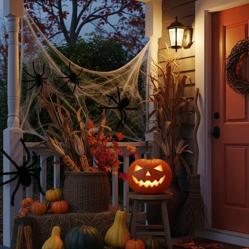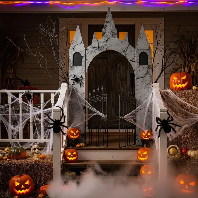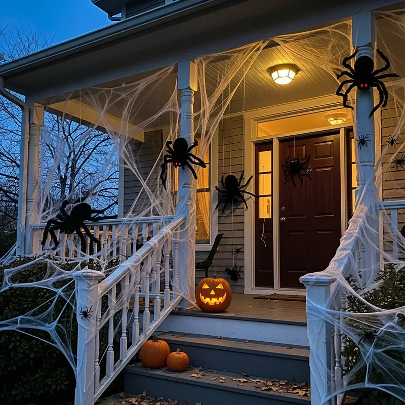 Weave an intricate network of spider webs that makes your porch look like it's been abandoned for centuries. Stretch synthetic webbing across corners, between pillars, and over doorways, pulling strands apart for realistic wispy effects. Place oversized spiders strategically throughout webs, mixing sizes from tiny babies to massive furry tarantulas. Create dimensional webs using rope or yarn in geometric patterns for a more artistic, less crafty appearance. Add plastic flies and other insects caught in webs for realistic detail that rewards close inspection. Use glow-in-the-dark spray on webs for nighttime visibility that creates an eerie green shimmer. Layer different web materials like cotton batting underneath synthetic webbing for varied textures and depths. Position battery-operated jumping spiders on motion sensors near your door for guaranteed screams. Dust artificial webs with baby powder for that authentic abandoned look that says "enter at your own risk."