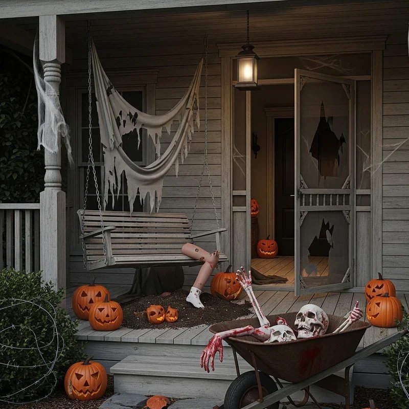 Stage a post-apocalyptic nightmare where the undead have overtaken your once-peaceful porch entrance. Create zombie mannequins using old clothes stuffed with newspaper, adding latex masks for grotesque faces. Position zombies climbing porch railings, pressed against windows, and emerging from decorative bushes. Add torn caution tape, quarantine signs, and fake blood splatters for authentic outbreak atmosphere. Set up abandoned survival supplies like overturned chairs, scattered belongings, and half-eaten (fake) remains. Use strobe lights during peak trick-or-treat hours to create disorienting effects that enhance the chaos. Include recorded emergency broadcast messages playing on loop from hidden speakers. Scatter body parts made from painted foam or latex around your porch strategically. Have one actor friend dress as a survivor occasionally stepping out to warn approaching visitors about the "danger."