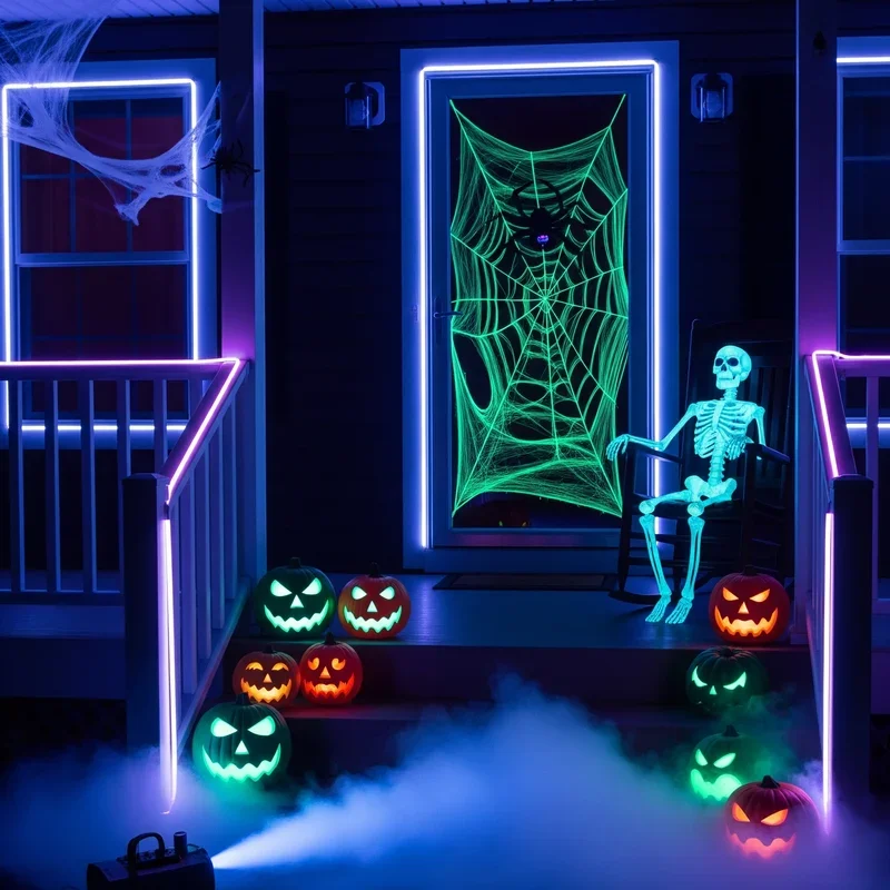 Install black lights to reveal hidden horrors that only appear under ultraviolet illumination. Paint invisible messages on walls using UV-reactive paint that glows eerily. Create ghostly handprints and footprints leading to your door mysteriously. Use fluorescent materials in decorations for unexpected glowing elements throughout displays. Add UV-reactive makeup to mannequins or masks for supernatural face effects. String fluorescent spider webs that become visible only under black light. Include reactive laundry detergent in fake cobwebs for bright white glowing. Position lights to avoid shining directly in visitors' eyes while maximizing coverage. Combine with regular lighting for dramatic transitions between normal and supernatural views.