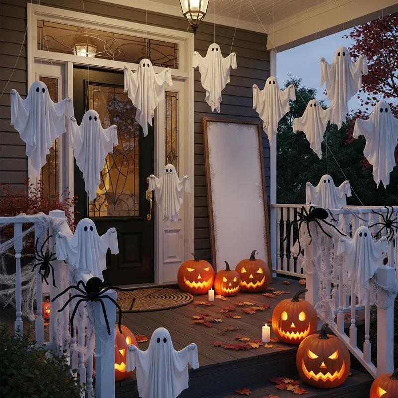 Transform your porch ceiling into a supernatural gathering spot where ethereal spirits seem to float mysteriously overhead. Create ghosts using white sheets, styrofoam heads, and glow-in-the-dark paint for faces that become visible as darkness falls. Hang them at varying heights with clear fishing line, ensuring they move naturally with the breeze for that authentic haunting effect. Use different sized forms to create ghost families, from tiny child spirits to towering adult apparitions. Install black lights underneath to make white fabric glow eerily while keeping the fishing line invisible to viewers. Add motion-activated speakers hidden among decorations that emit ghostly moans when people approach your door. Spray fabric stiffener on sheet edges to create dramatic flowing effects that look like ghosts caught mid-flight. Layer cheesecloth over some ghosts for varied textures that catch light differently, creating depth in your spectral display.
