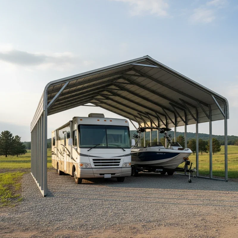 Oversized metal carports protect recreational vehicles, boats, trailers, and equipment with extra-tall, extra-wide configurations that standard carports can't accommodate. These specialized structures feature clearances reaching 14 feet or higher to shelter RVs with roof-mounted accessories. Extended lengths accommodate large motorhomes, travel trailers, or boats on trailers completely. The substantial coverage protects expensive recreational investments from UV damage, weather deterioration, and debris accumulation. Metal construction provides strength necessary for larger spans without excessive support posts that would obstruct maneuvering. These carports often include extended eaves that provide additional weather protection around parked vehicles. The open design allows for air circulation that prevents moisture accumulation and mildew growth on stored items. Anchoring systems secure these larger structures against wind uplift forces. Adding partial walls or end closures enhances security for valuable recreational equipment.